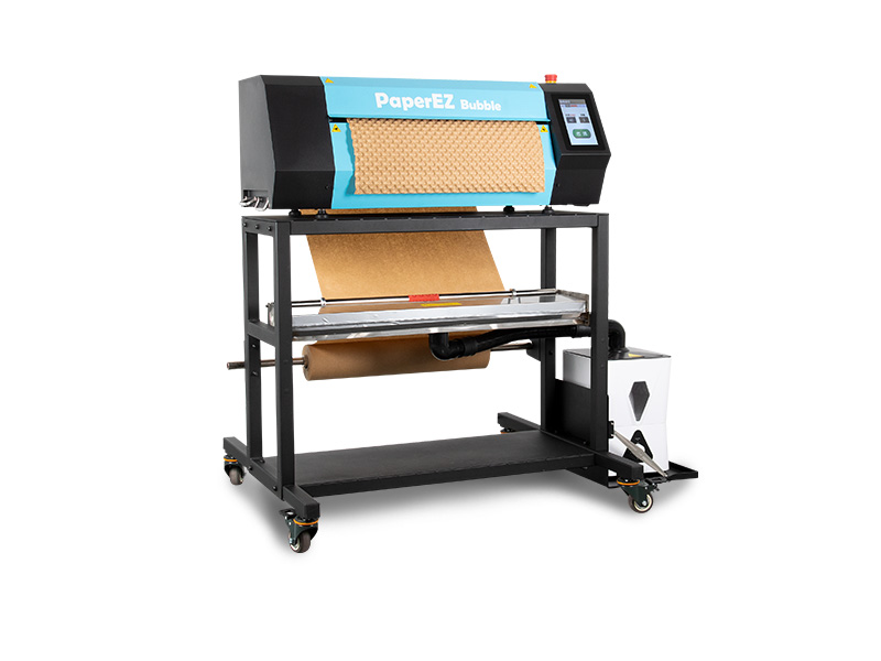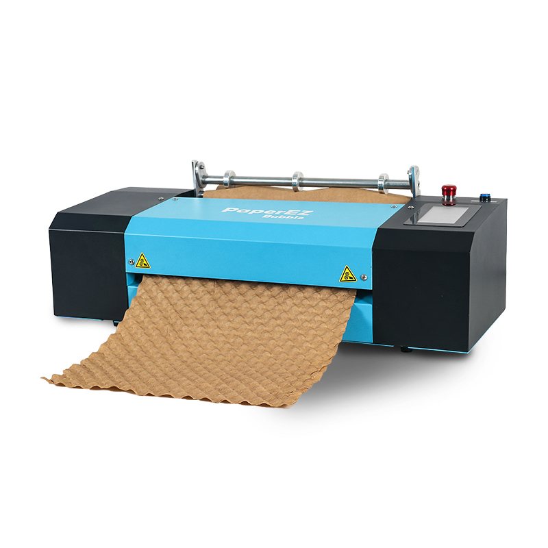 PaperEZ 壓泡紙機(Bubble Machine)PZB-2可自動將牛皮紙卷或風琴紙進過加濕和烘烤擠壓形成3D且富有彈性凸起結構的壓泡紙,最大支持寬幅升級660mm壓泡紙,可自動出紙、自動裁剪、自動記米,也可配合腳踏進行操作控制,壓泡紙在物流運輸中起到有效緩沖、避免包裹互相碰撞的作用。