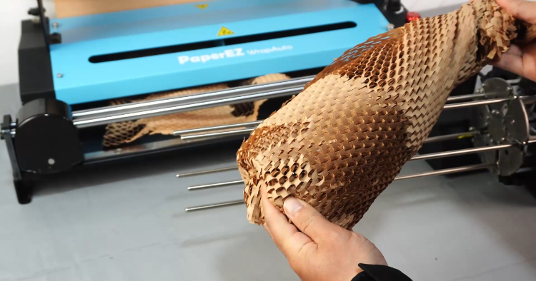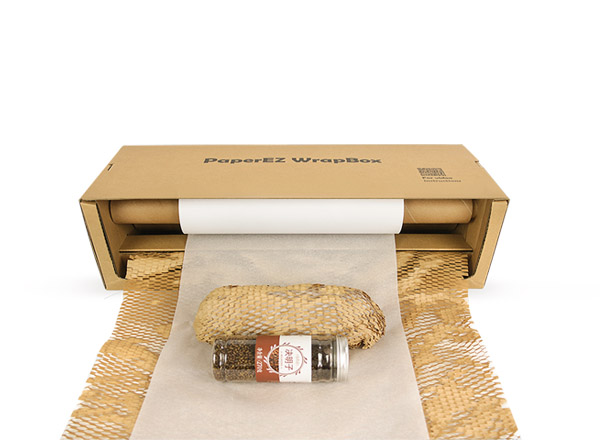PaperEZ蜂窩紙卷(Honeycomb Paper)是將一卷蜂窩狀的牛皮紙經走紙機伸展后,形成立體多棱角蜂窩單元層襯墊,使被裹包物起到很好的緩沖防護效果,搭配內襯一層軟白紙,使被包裹物不易抖漏及刮擦。