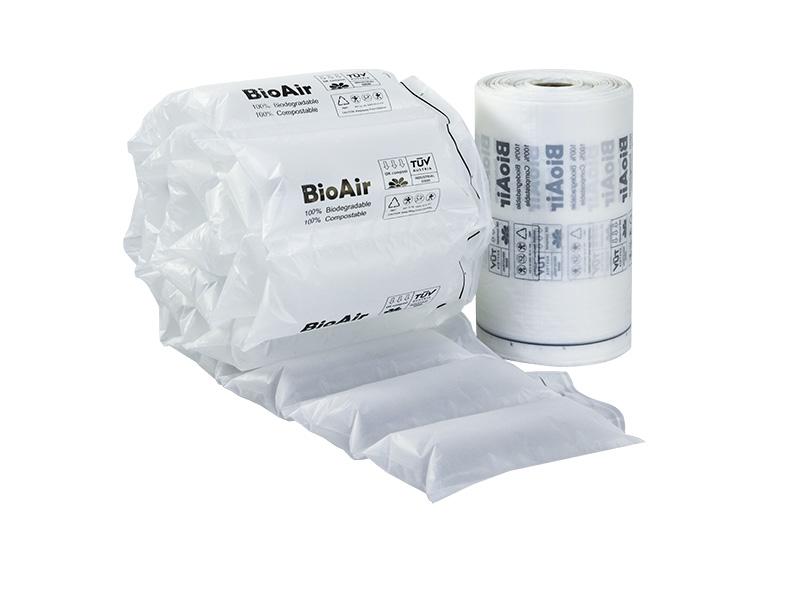 BioAir 全生物降解氣泡枕(Filler)BioAir (Compostable Air Pillow)是由全生物降解材料(PBAT)通過吹膜設備和制袋設備制成的氣囊狀薄膜產品。使用時經過充氣設備充氣熱封后,用于包裝容器內產品的填充、減震、穩固產品,可有效吸收貨物運輸過程中因晃動、震動、碰撞、拋丟所帶來的沖擊力,起到緩沖保護的作用,確保產品運輸安全。同時在自然環境中分裂降解為二氧化碳和水,一款環保可降解的緩沖保護包裝材料。