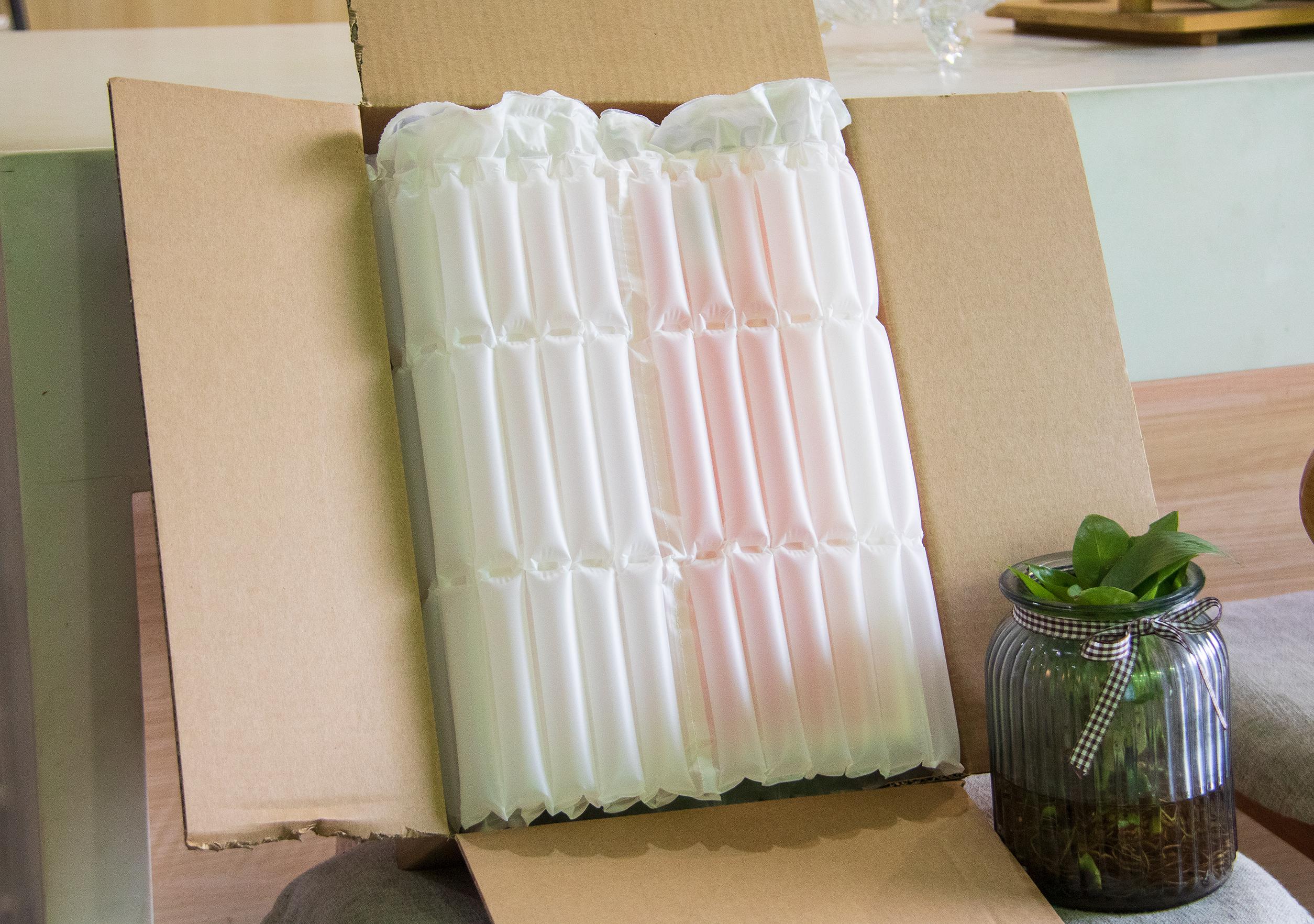 MINI AIR 直柱卷材是LDPE和PA材料通過吹膜設備共擠復合而成,自帶充氣閥,使用時經過充氣設備或氣槍充氣后,用于包裹貨物,可有效吸收貨物運輸過程中因晃動、震動、碰撞、拋丟所帶來的沖擊力,起到緩沖保護的作用。